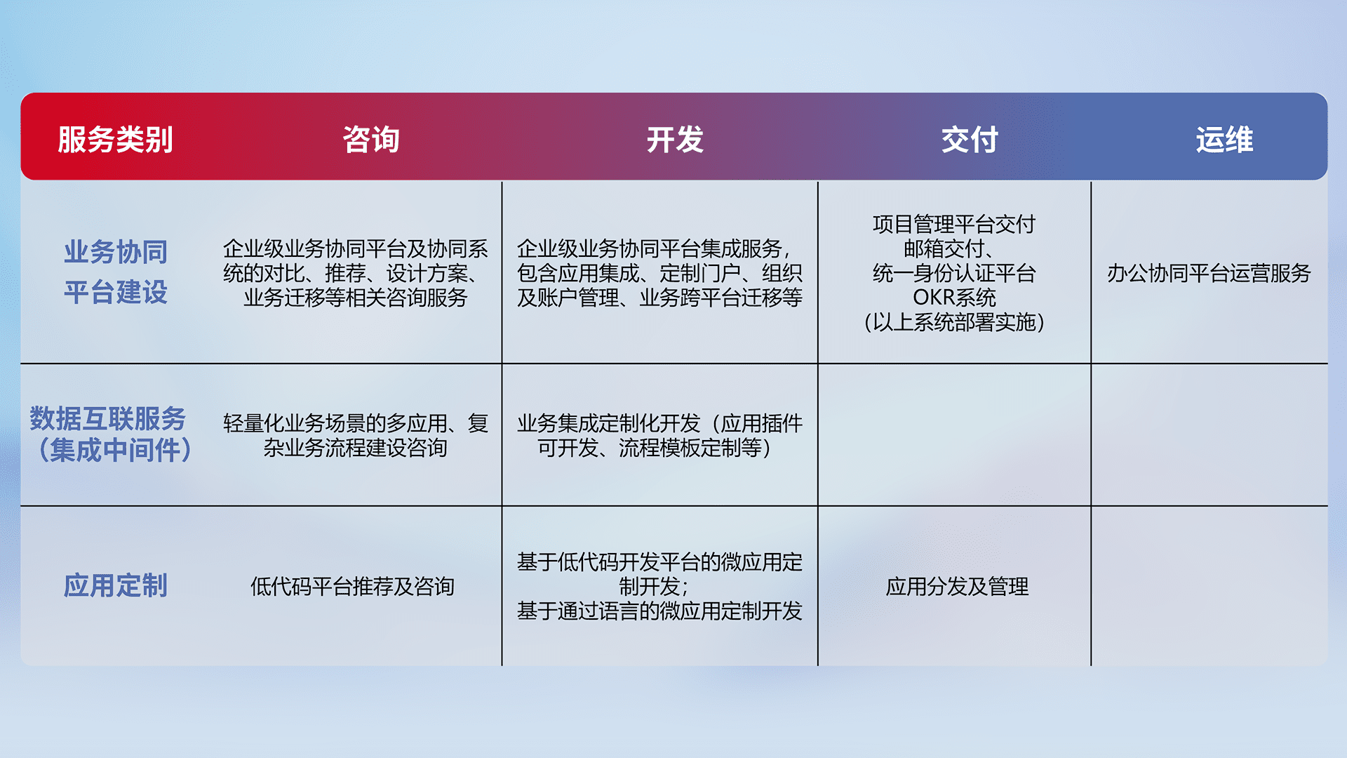 针对钉钉、、、、企微、、、IDaas等平台级产品提供产品的规划、、方案、、、交付、、、、定制化开发等服务,,实现如统一协同办公、、、智能客户服务、、、混合会议管理、、、、智能数据查询、、、等业务场景,,实现数字化转型。。。。
