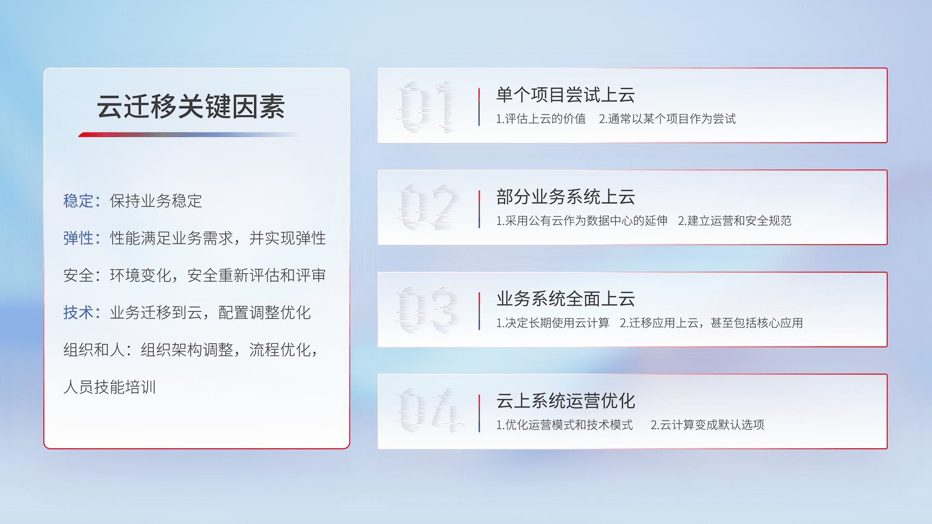 结合实际业务,,,,从规划设计、、、云平台选型、、、、云原生改造、、、、数据迁移、、、、集成交付,,迁移全过程为客户识别最佳上云路径,,,做好风险识别管理,,设计网络架构、、、身份权限、、、安全审计合规、、操作审计、、日志审计、、监控告警策略、、、多站点容灾设计等,,,对云上基础设施进行整体规划,,,提升IT治理水平,,以满足弹性、、、高可用、、高性能的需求。。。。