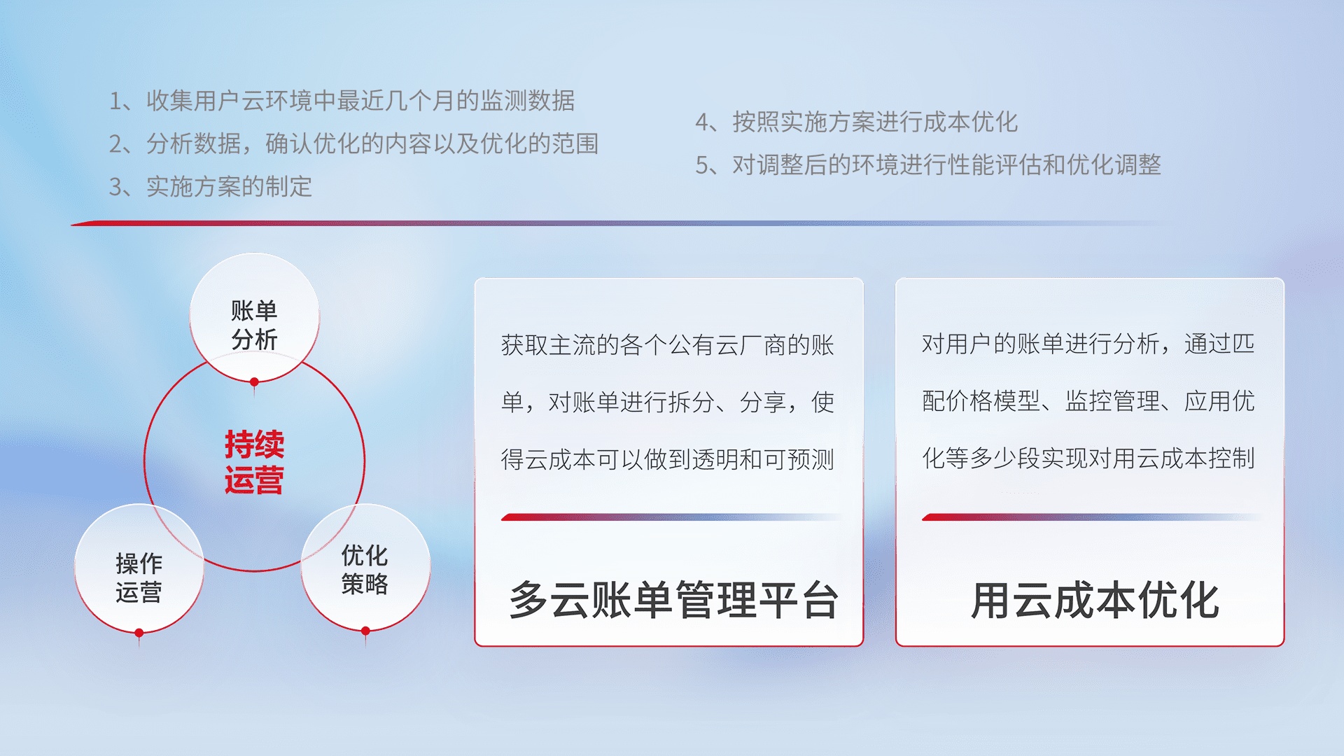 通过多云纳管,,以统一的资源数据模型把客户的云资源进行抽象和封装,,,,进而实现对多云资源的统一操作,,,,保障云资源管理的可靠性、、稳定性与可用性。。量身定制化运维内容,,配置、、、开发运维、、补丁管理、、、备份、、监控、、、、认证和访问管理、、审计和日常巡检等,,,,保障在用云过程中的可靠度,,,稳定度以及高可用率。。。。